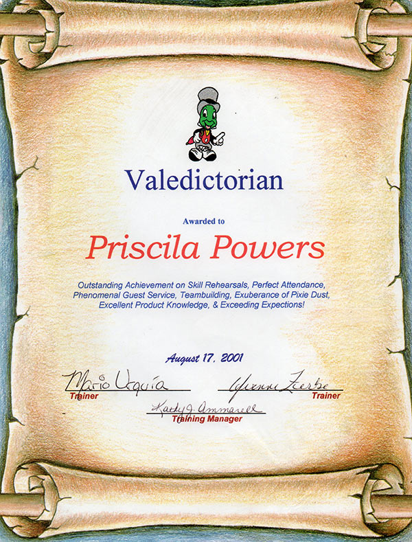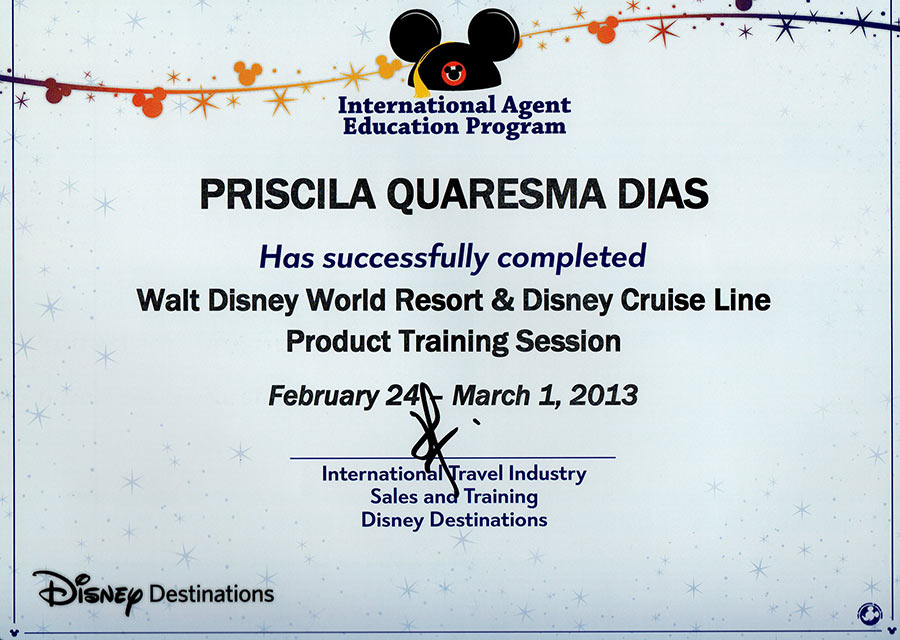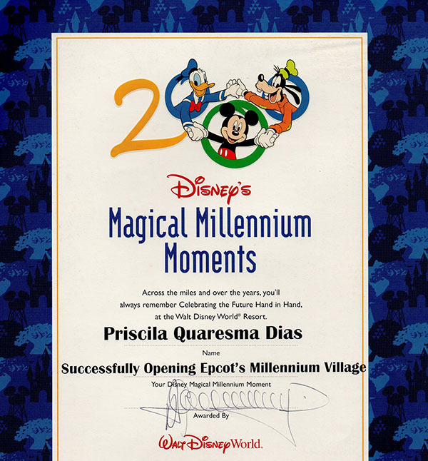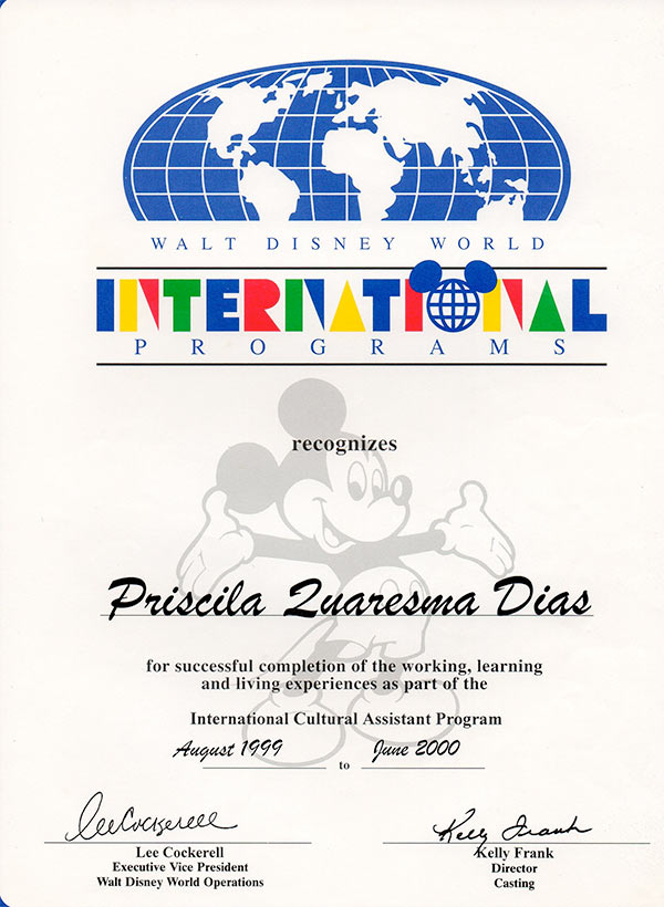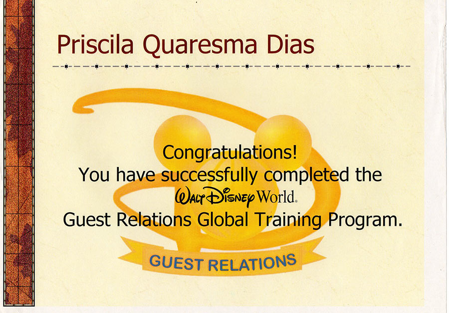 Fui a representante mais jovem a ser contratada para esse programa. Trabalhei na Walt Disney World Company por mais 2 anos, até voltar para o Brasil em Setembro de 2002. Nesse período, participei de diversos treinamentos promovidos pela empresa, ganhando o prêmio de melhor aluna – Valedictorian – e me tornando Walt Disney Travel Company Agent aos 20 anos.